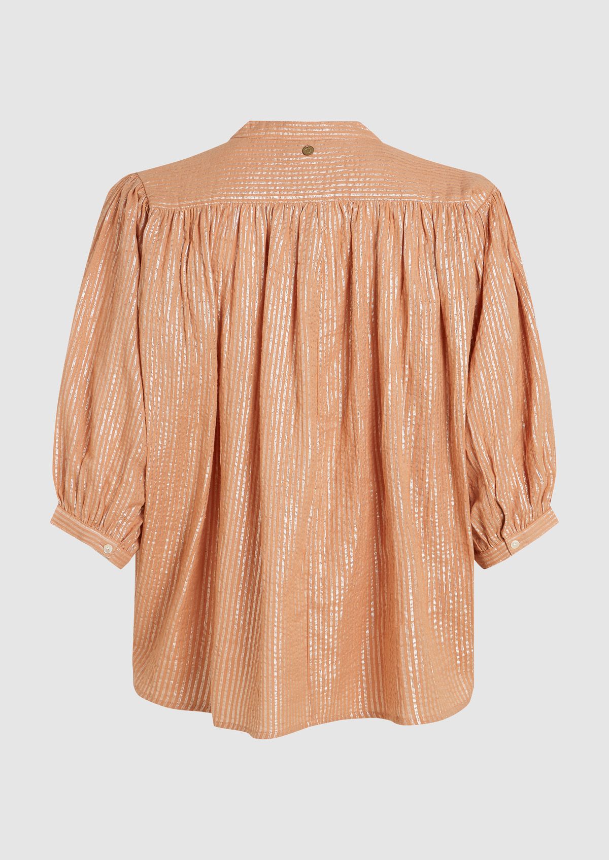 Luchtige meisjes blouse gemaakt van katoen met een oranje metallic streeppatroon. De Britt blouse heeft een loose fit met een knoopsluiting en pofmouwen met een 3/4 lengte. Ook verkrijgbaar in een andere kleur.