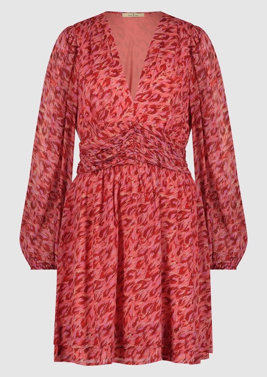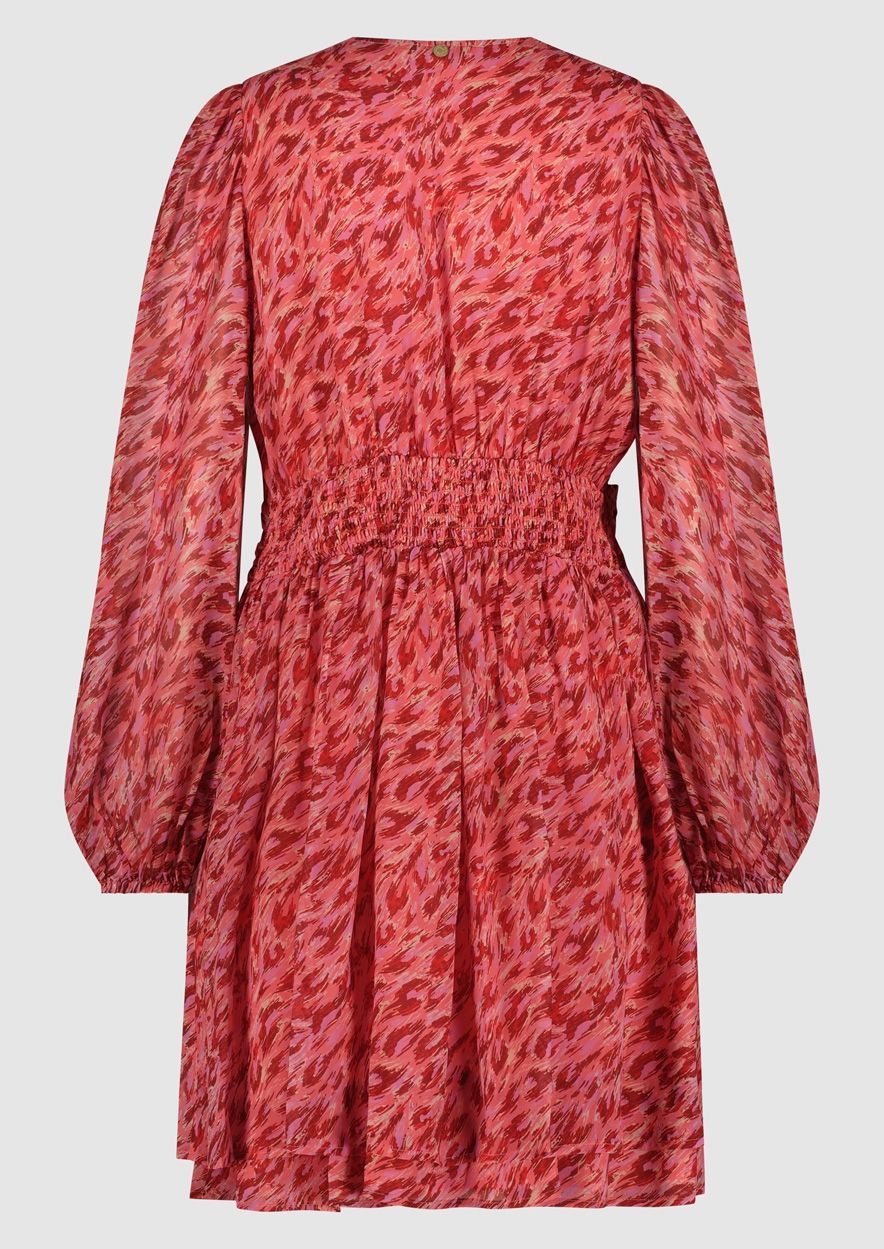 Zomerse jurk gemaakt van zacht viscose met een roze dierenprint. De Elvy dress heeft een v-hals, wijde mouwen met elastische manchetten en is op de schouders en voorkant afgewerkt met geplooide details.