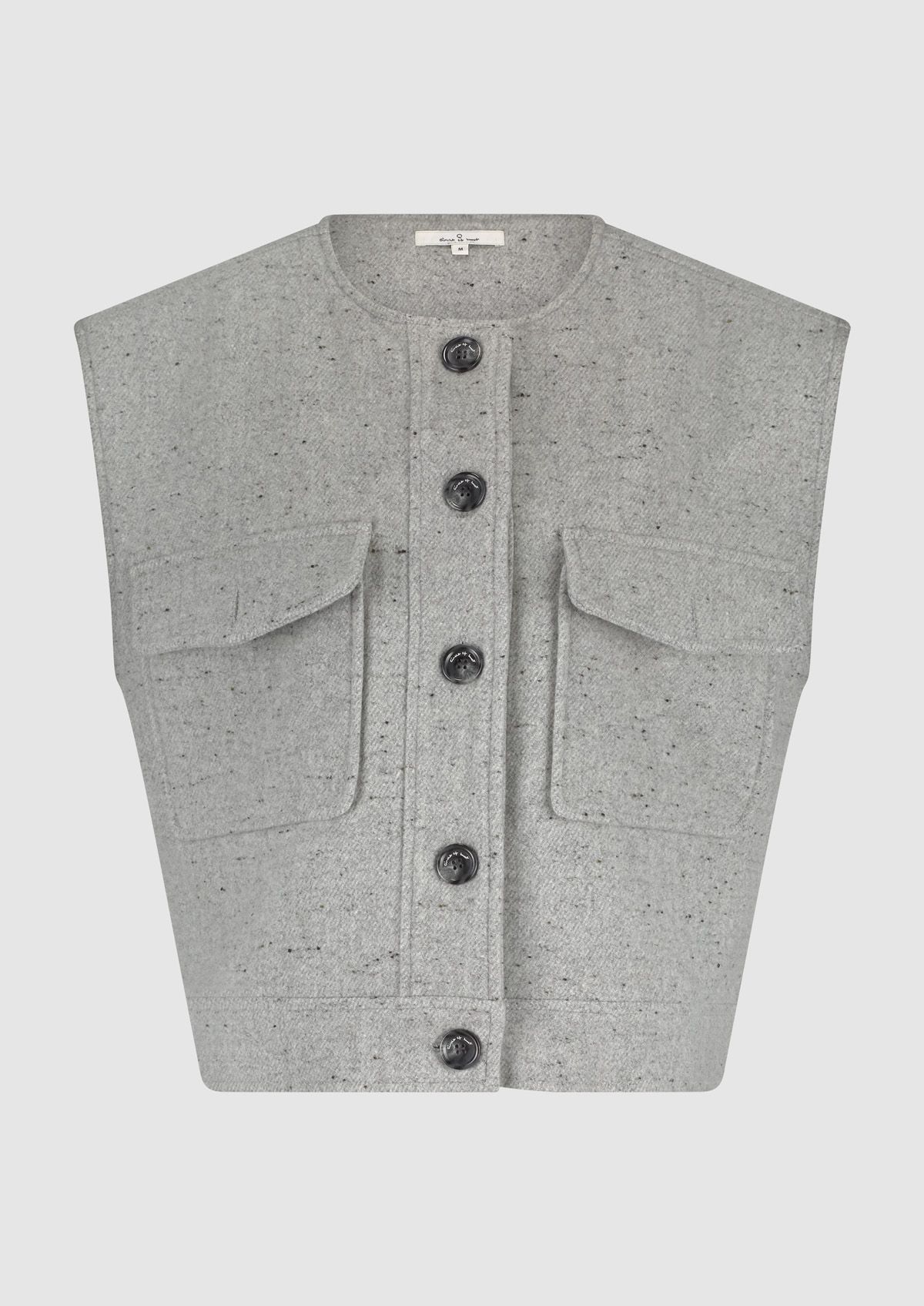 Wollen dames gilet uitgevoerd in een gemêleerde lichtgrijze tint. Het Sue gilet heeft een losse fit met een knooplsuiting en klepzakken op de voorkant.