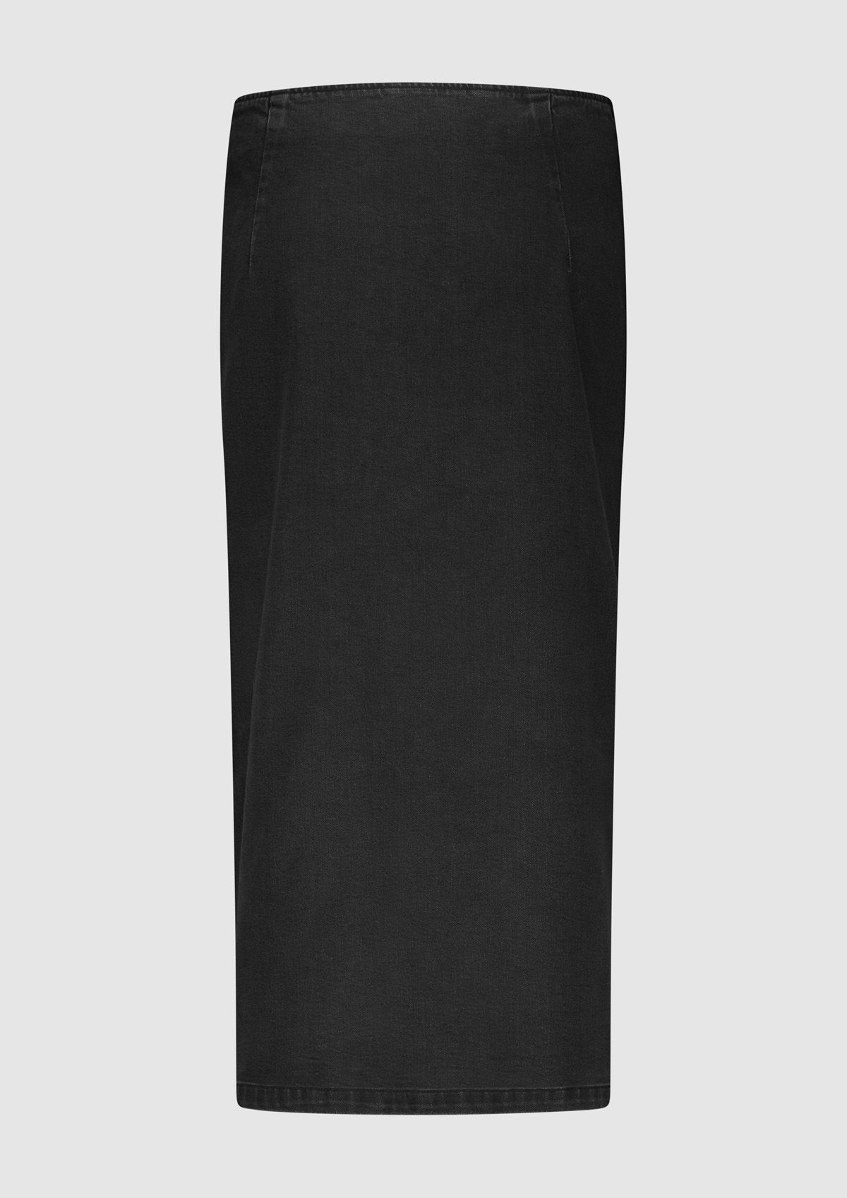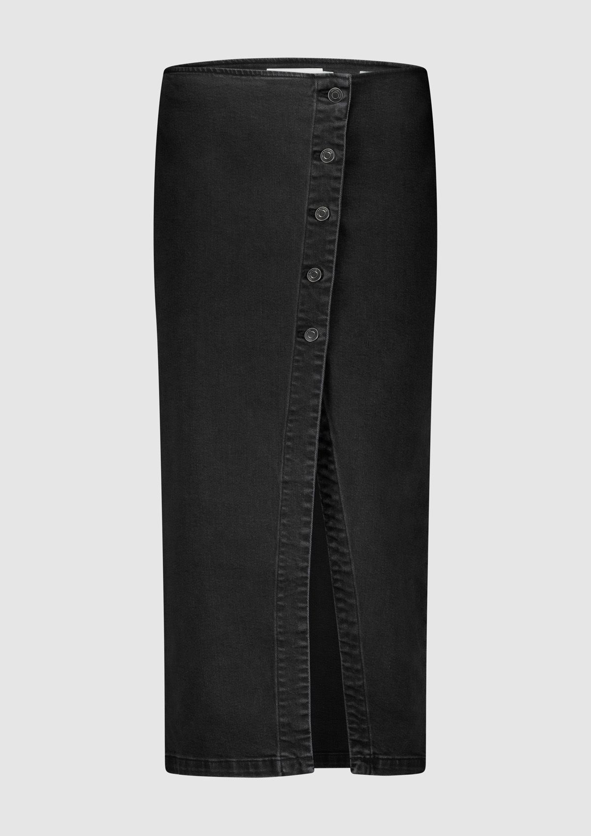 Midi spijkerrok gemaakt van stretch denim in een vintage zwarte wassing. De Ulla skirt heeft een aangesloten fit zonder tailleband en een assymetrische knoopsluiting met split.
