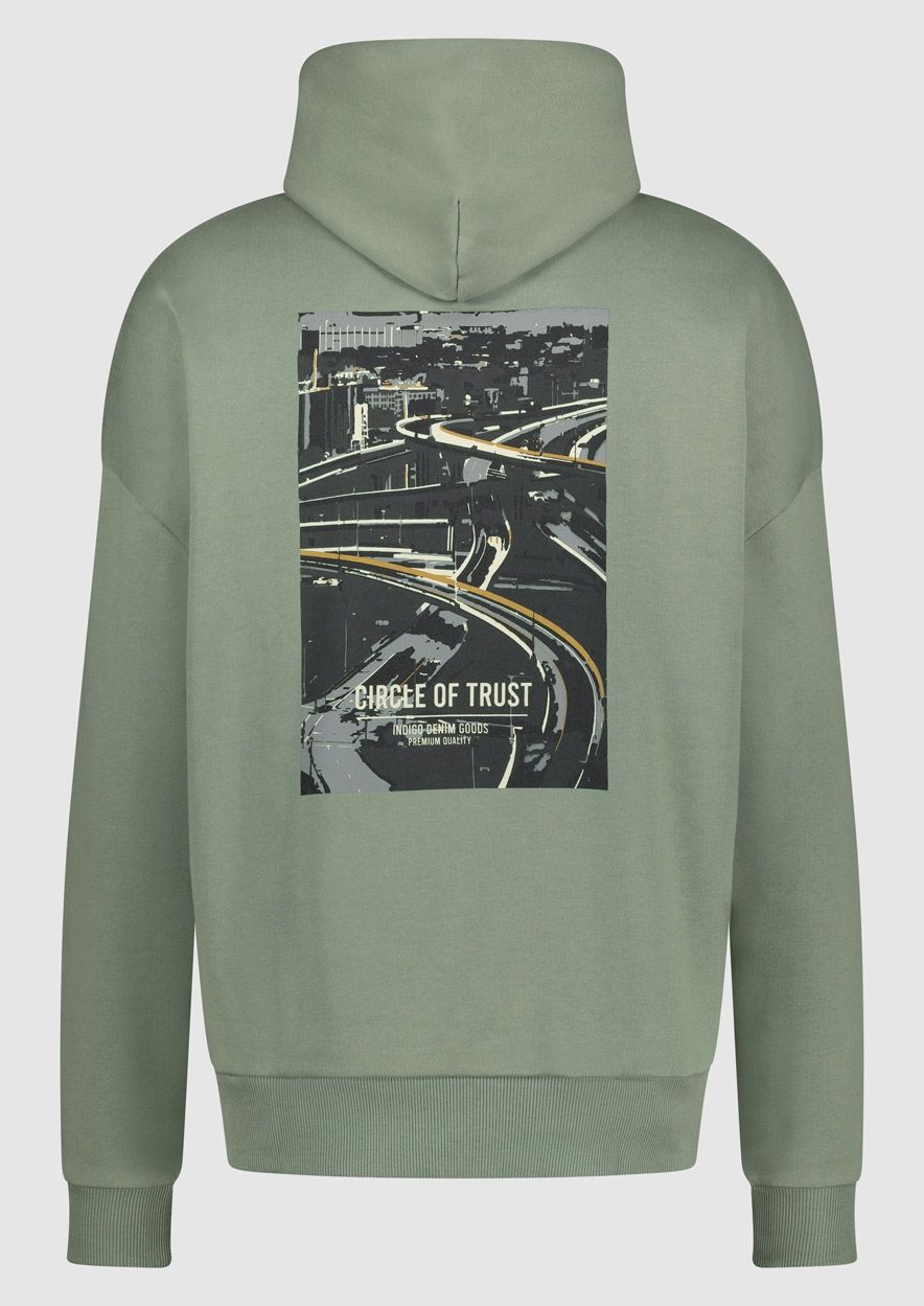 katoenen heren sweater met capuchon uitgevoerd in het groen met een urban print op de rug. De Damian hoodie heeft een regular fit en is voorzien van een kangoeroezak.