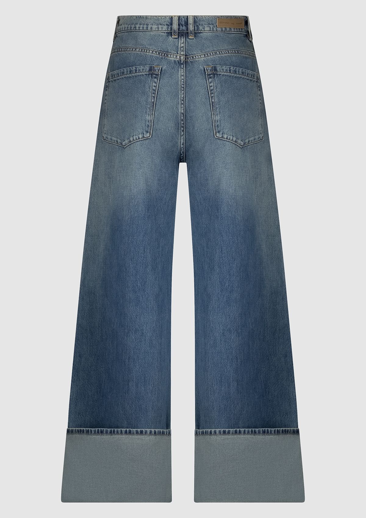 De Luxx is onze wide leg denim met dubbele steekzakken aan de voorkant en een omslag onderaan de broekspijpen. De broek heeft een blauwe wassing met een lichte fade.