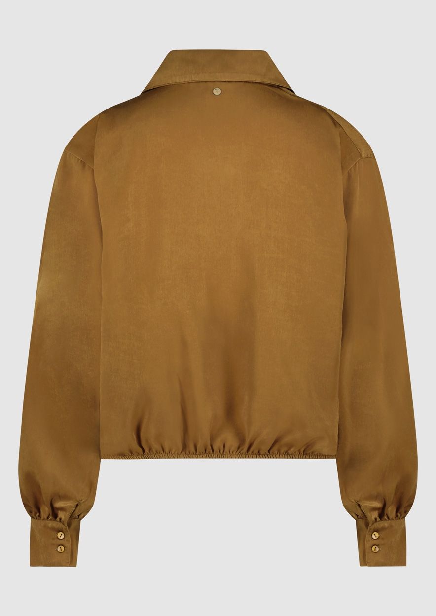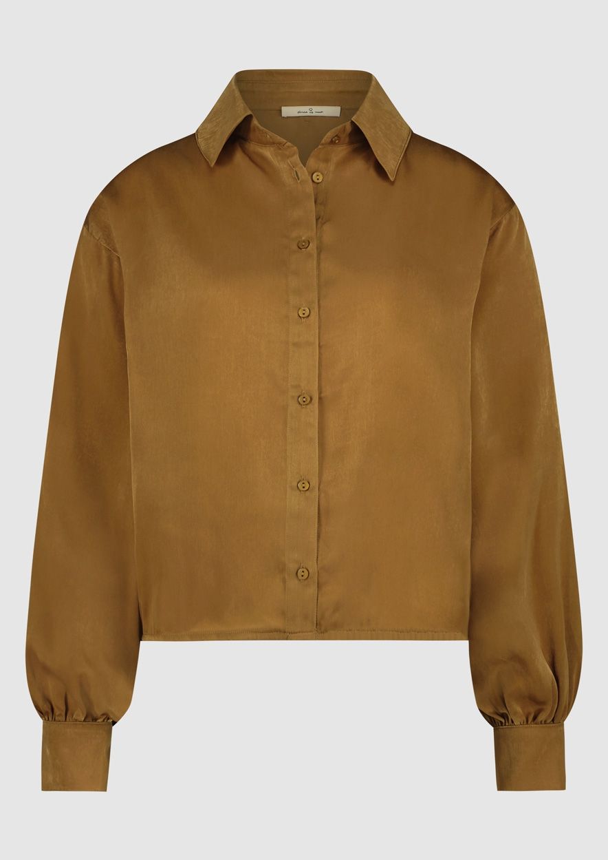 Soepelvallende satijnen top uitgevoerd in een lichtbruine tint. De Xiomara top heeft een knoopsluiting, drop shoulders en een cropped lengte met een elastische boord aan de onderkant.