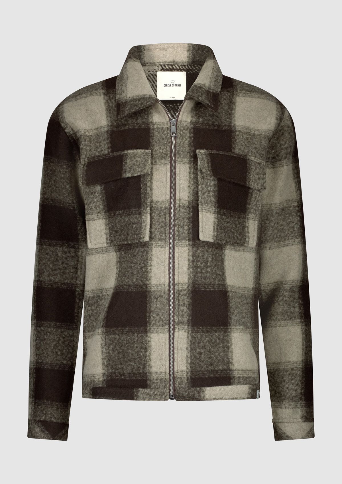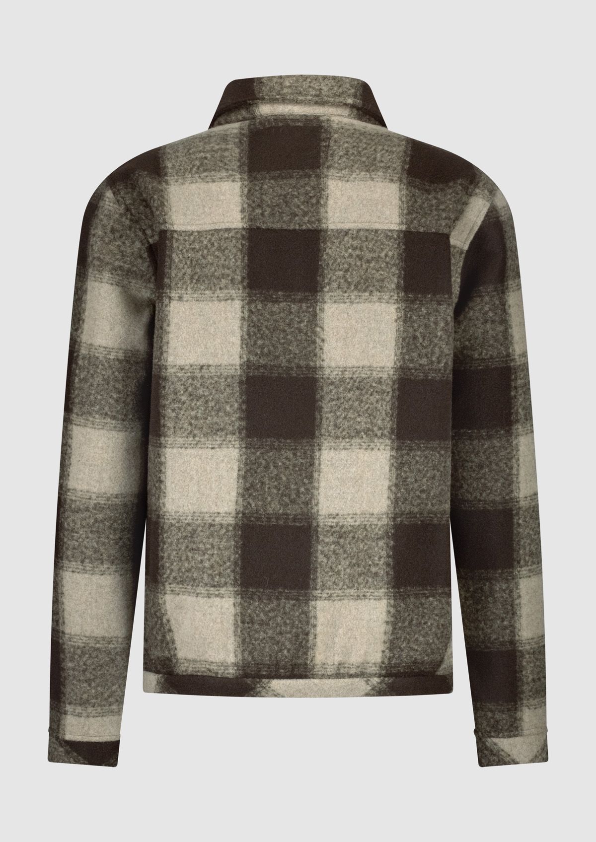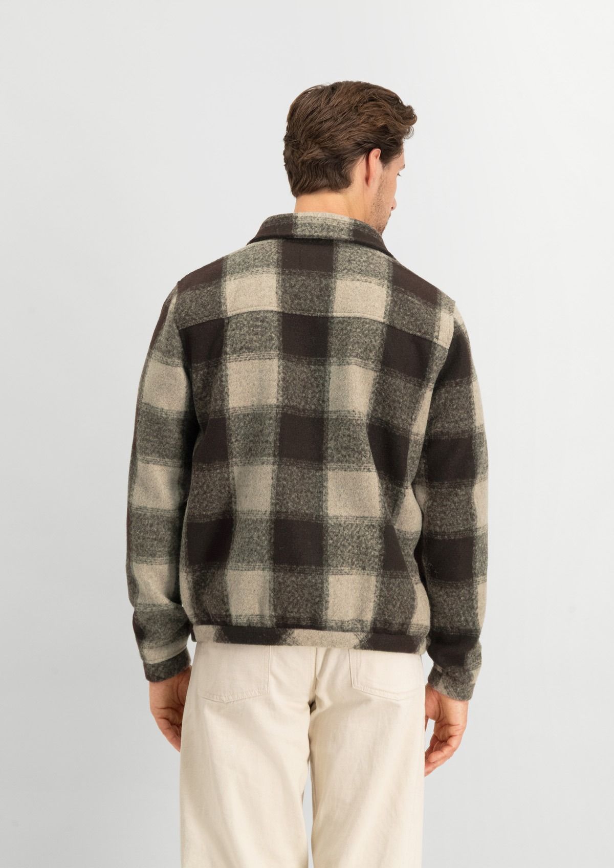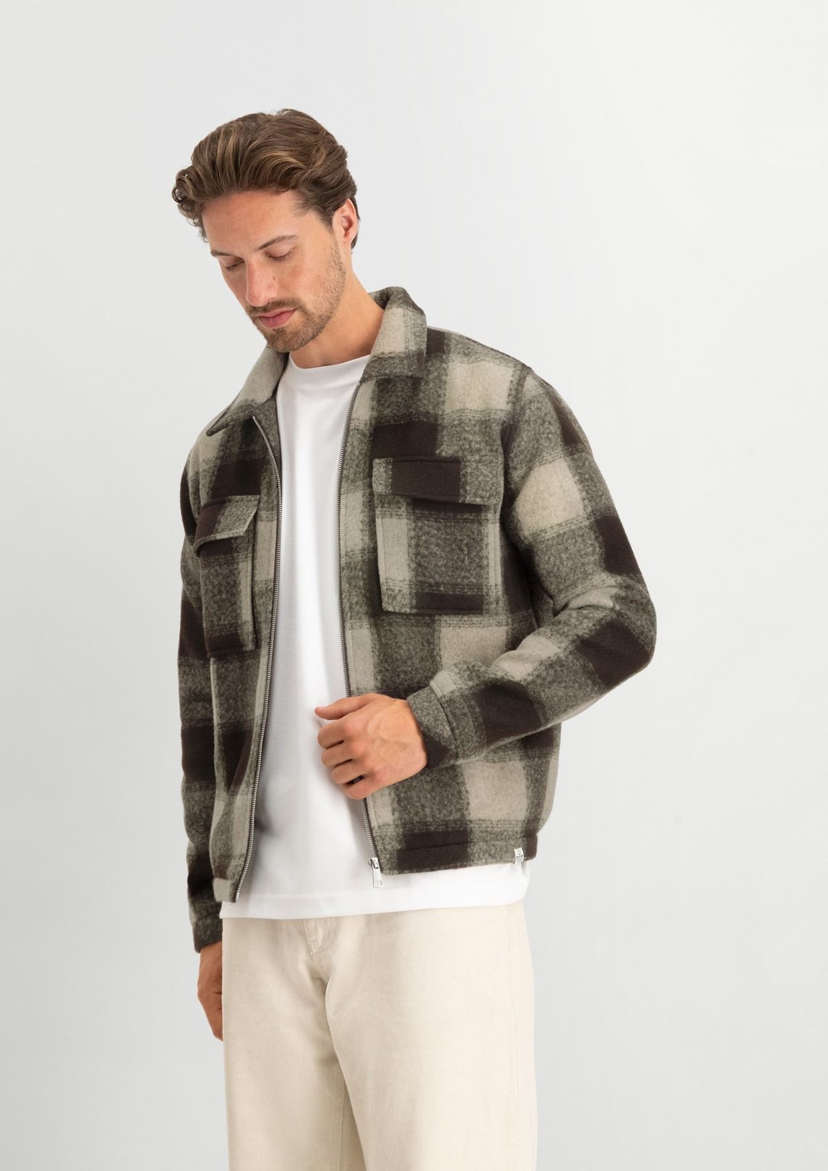 Winters herenvest met een crème-bruin ruitpatroon. Het Zane overshirt heeft een regular fit met een ritssluiting en klepzakken op de borst.